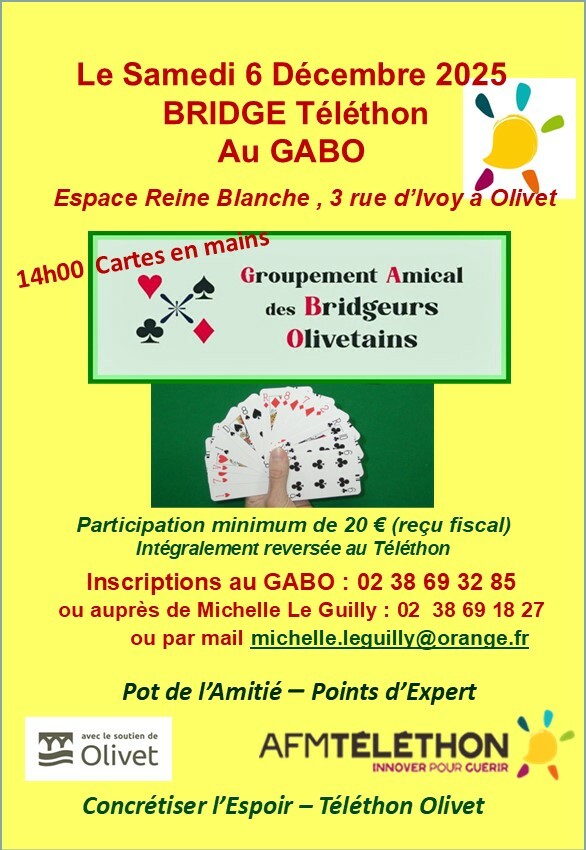 Le 6 décembre 2025, 48 bridgeurs se sont retrouvés au GABO, pour un tournoi. La participation de 1640 € a été intégralement reversée à l’AFM.